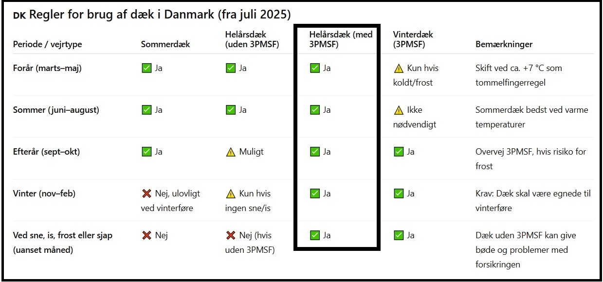 Ja — det er lovligt at køre med såkaldte helårsdæk (også kaldet “all-season” dæk) i Danmark efter den 1. juli, men der er nogle vigtige forbehold og regler, du skal være opmærksom på.