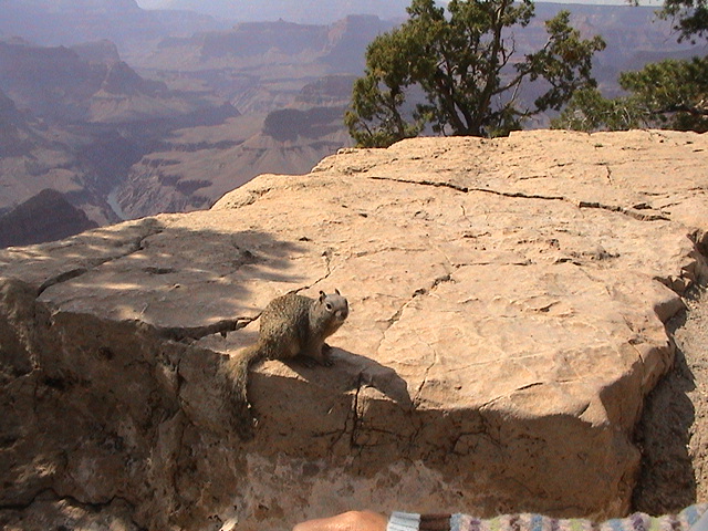 | Vi var dog også en lille flok, der nøjedes med apostelenes heste, idet vi i nogle timer spadserede langs kanten af det fantastiske landskab. Vi nød udsigten over verdens største kløft med de ufattelige dimensioner: Dybde 1,5 kilometer, bredde 7-30 kilometer og længde 3-400 kilometer. Til venstre i billedet et glimt af Colorado floden i bunden af kløften. Klik på billedet, og se det bedre. |