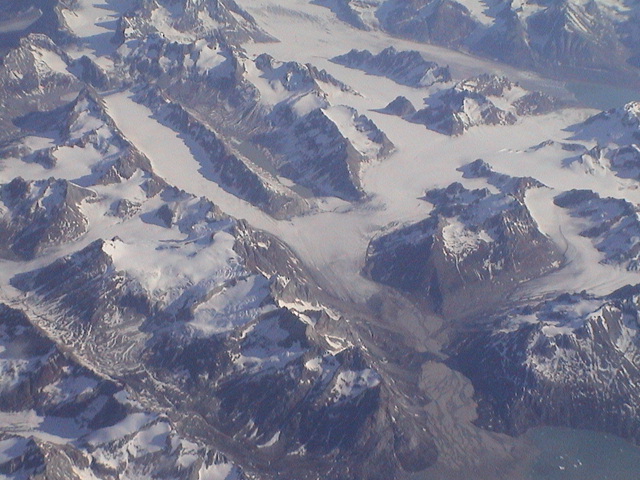 Her er vi i SAS-flyet kommet til Øst-Grønland. I nederste højre hjørne skimtes lidt af vandet fra Danmarks Strædet, navnet på farvandet mellem Grønland og Island.