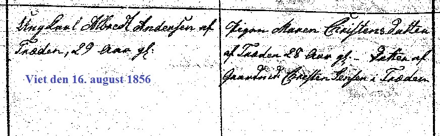 Maren Christensdatter og Albredt Andersen blev viet den 16. august 1856 i Træden