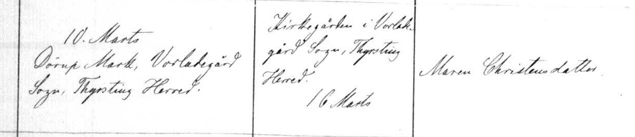 Maren Christensdatter dør den 10. marts 1892 efter at have været gift anden gang (27/4 1875) med Jørgen Hansen, Dørup